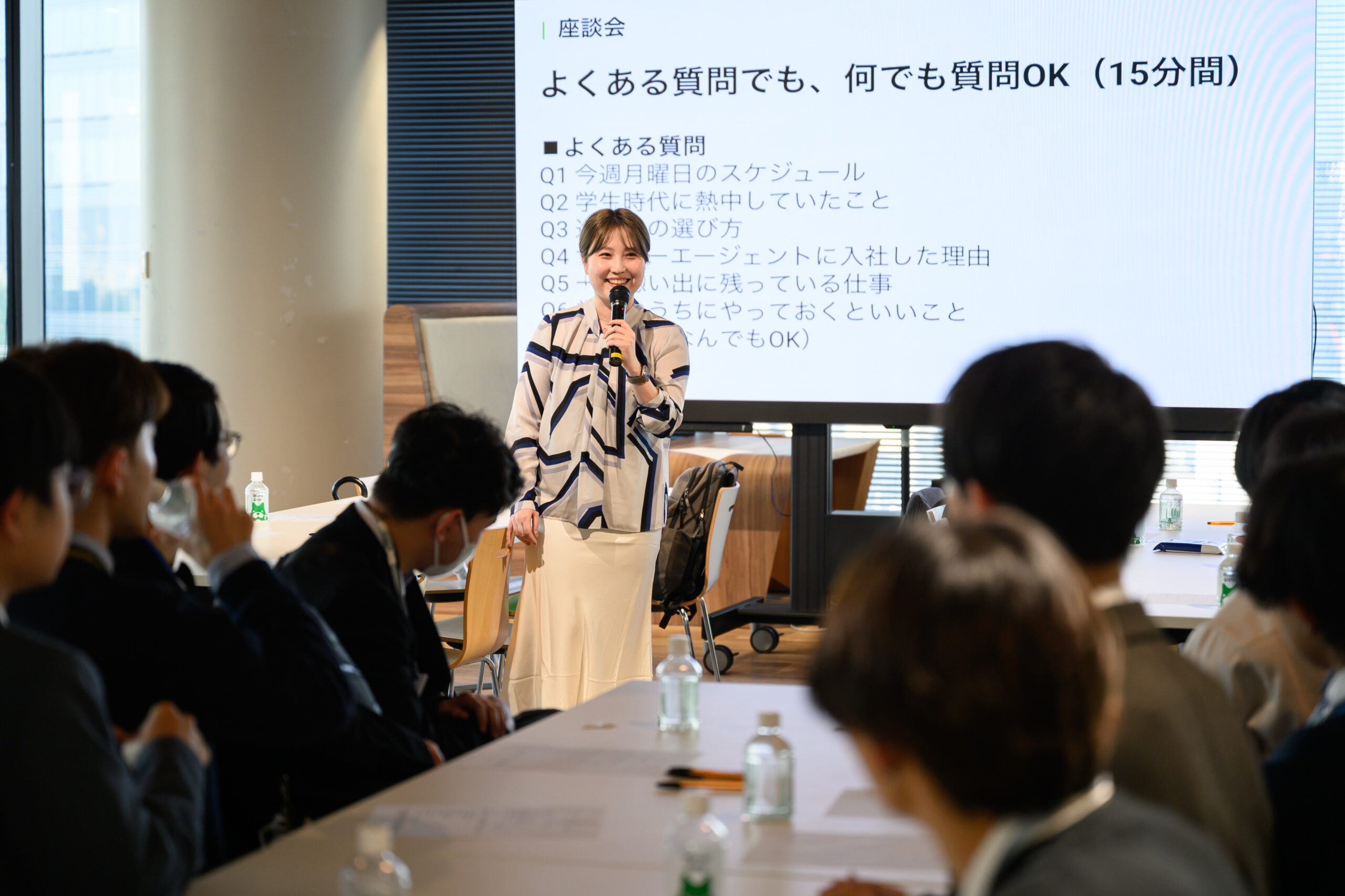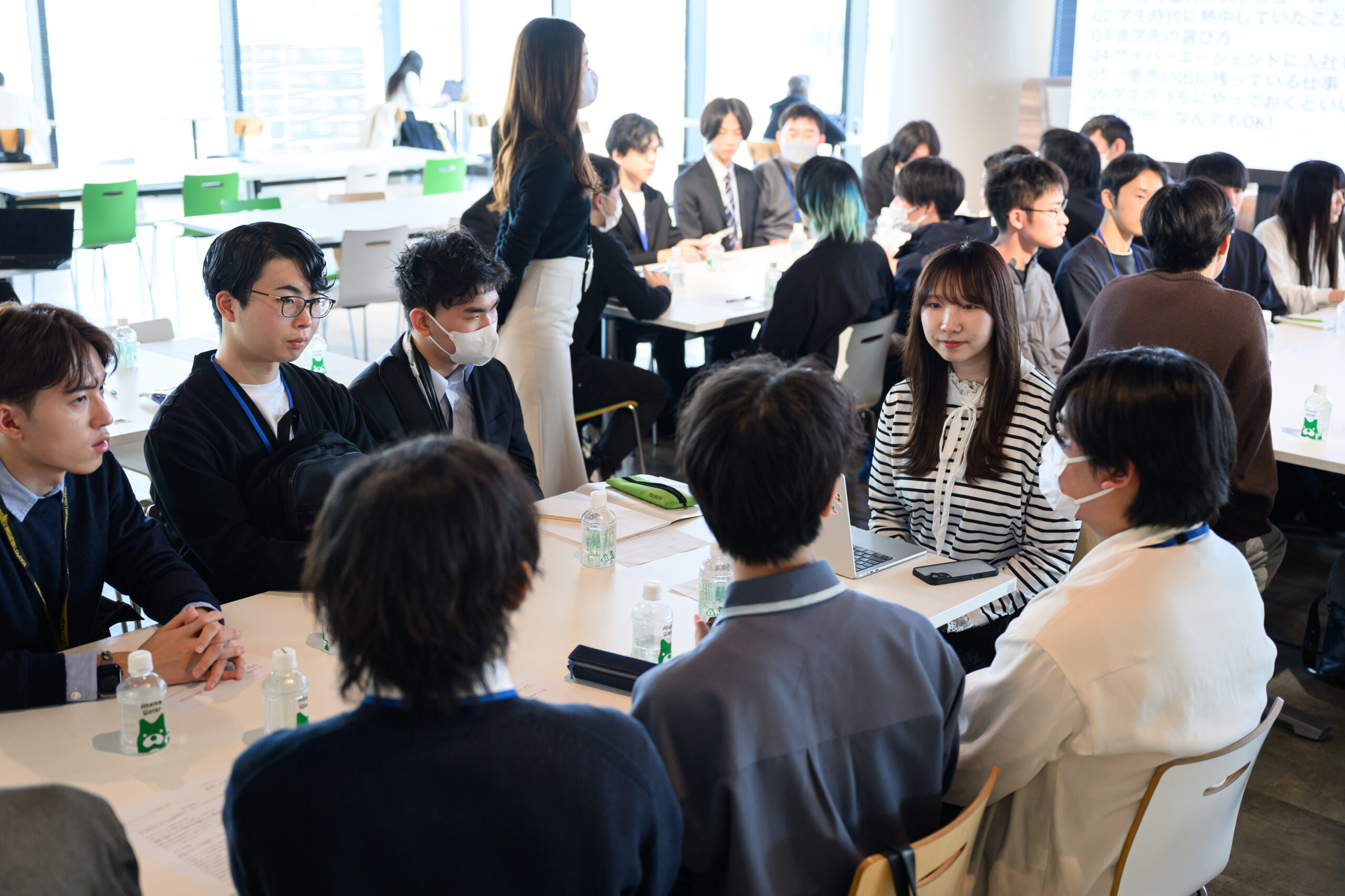 例えば、「あした会議」という新規事業や組織改革案などを提案・決議する会議があります。「あした会議」をきっかけに設立した子会社の数は32社、それら新規事業から累計売上高約3,259億円、営業利益約455億円(2021年時点)を創出。企業の持続的成長と、社員の育成に貢献しています。他にも、2年目以降の社員を対象に、オフィス出勤とリモートワークを併用するハイブリッド型の働き方を取り入れていること。「挑戦と安心はセット」という考えのもと、長く働き続けられる人事制度や福利厚生が整っていることを紹介しました。