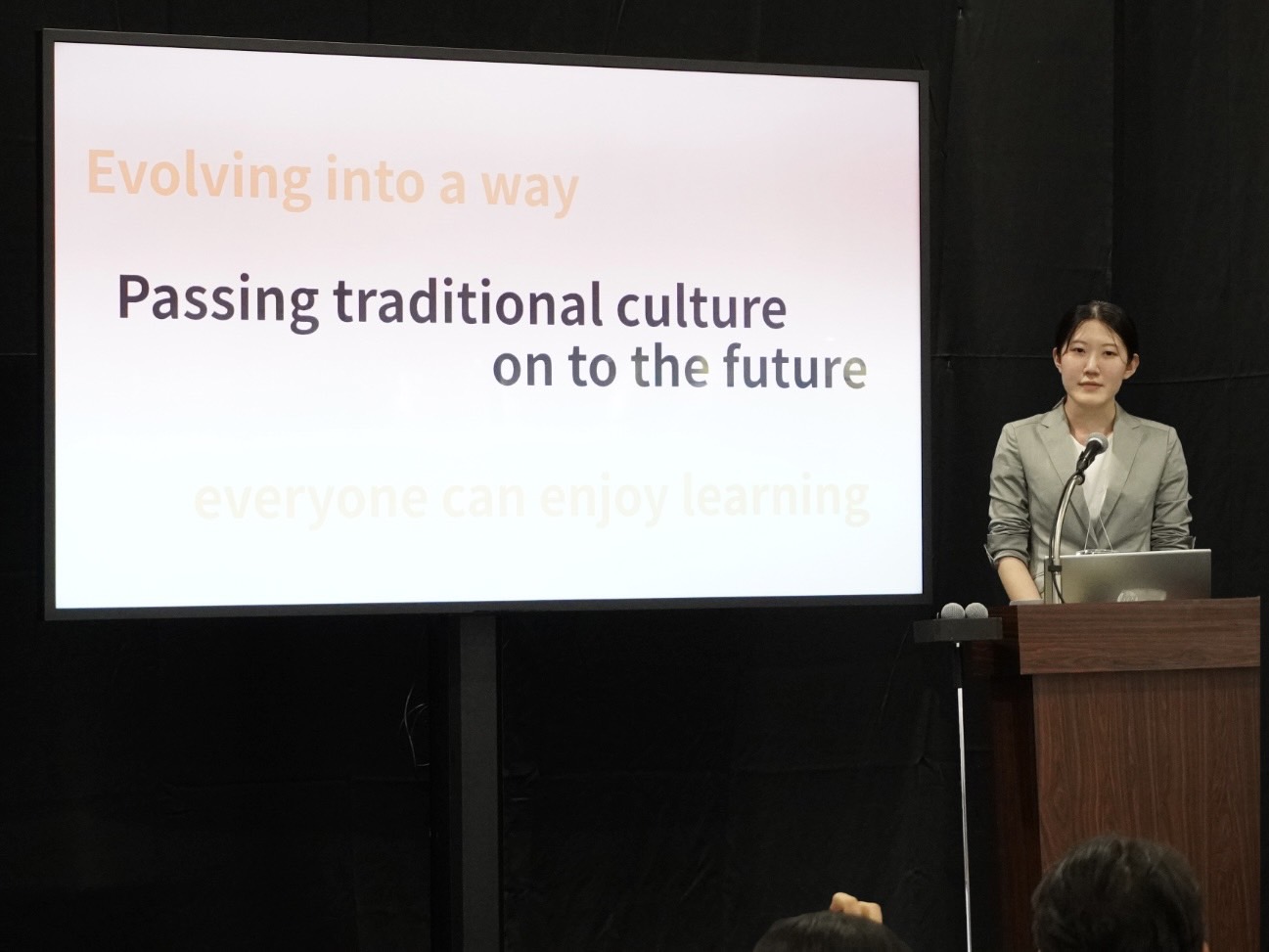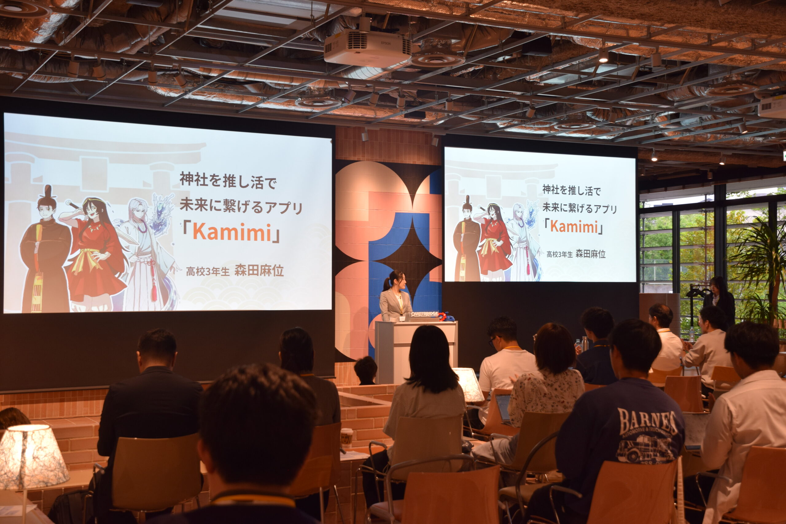 高等部3年の森田 麻位さんは、1年次から取り組んできた神社参拝と“推し活”を融合した次世代型アプリ『Kamimi』を発表。