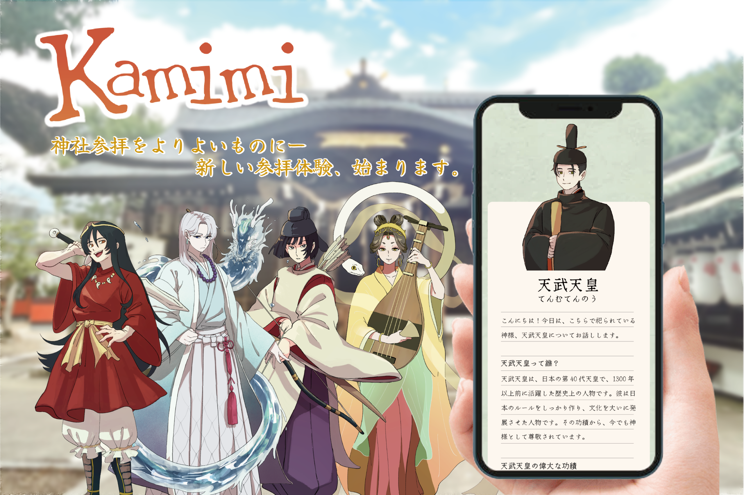 Kamimiは参拝先の神社に祀られる神様をキャラクターとして親しみやすく表現し、ユーザーが“推し”として楽しみながら神社の歴史や文化を学べるように設計されたオリジナルアプリです。